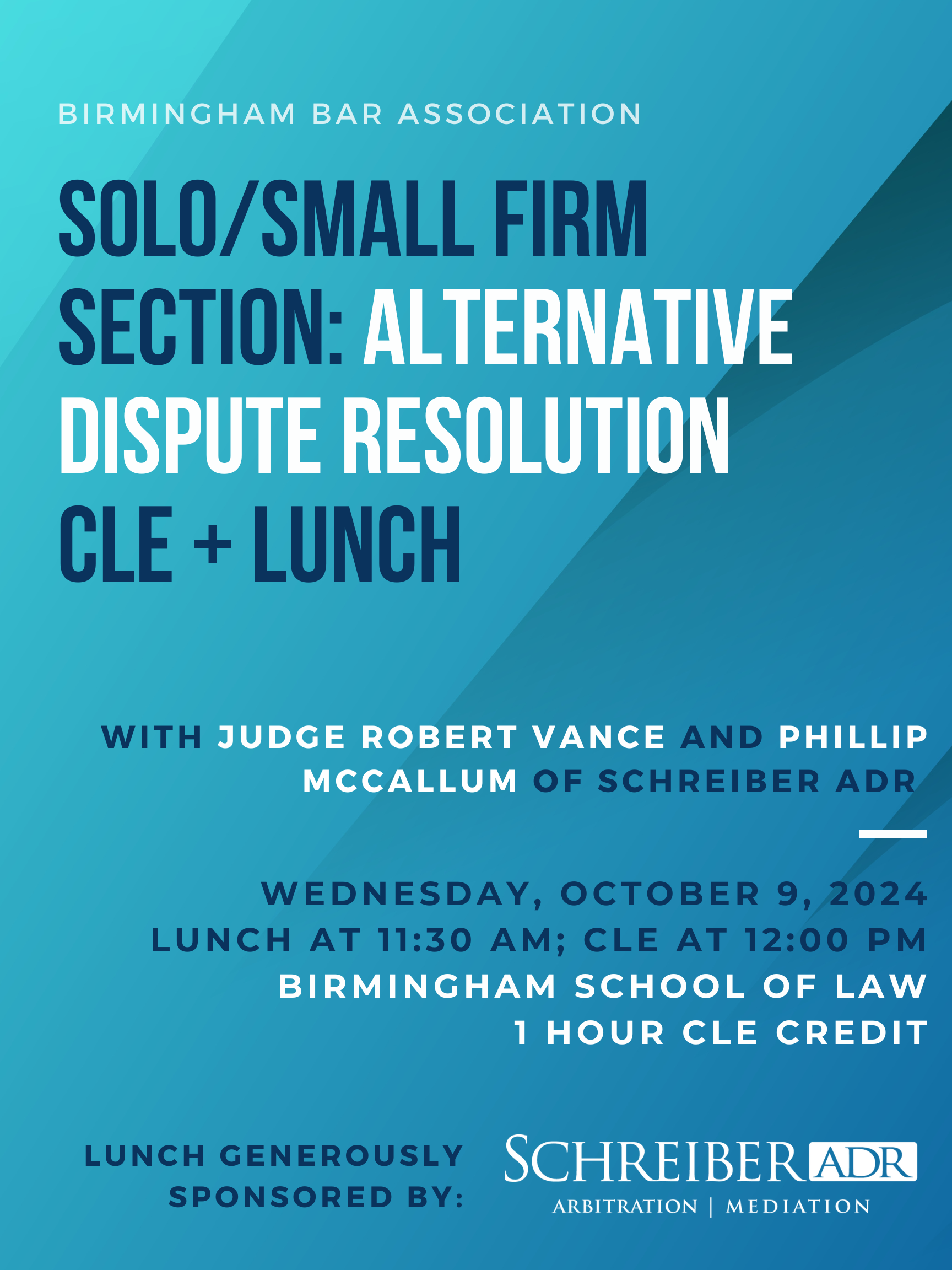 Join the Solo/Small Firm section for a CLE + Lunch and learn more about Alternative Dispute Resolution with Phillip McCallum and Judge Robert Vance. Lunch begins at 11:30 am followed by a panel discussion at 12:00 pm. Lunch is being generously sponsored by Schreiber ADR 1 hour CLE credit Free for Solo/Small Firm Section Members; join the Section ($30) to attend this and other Solo/Small Firm Section events Register soon, spaces are limited.