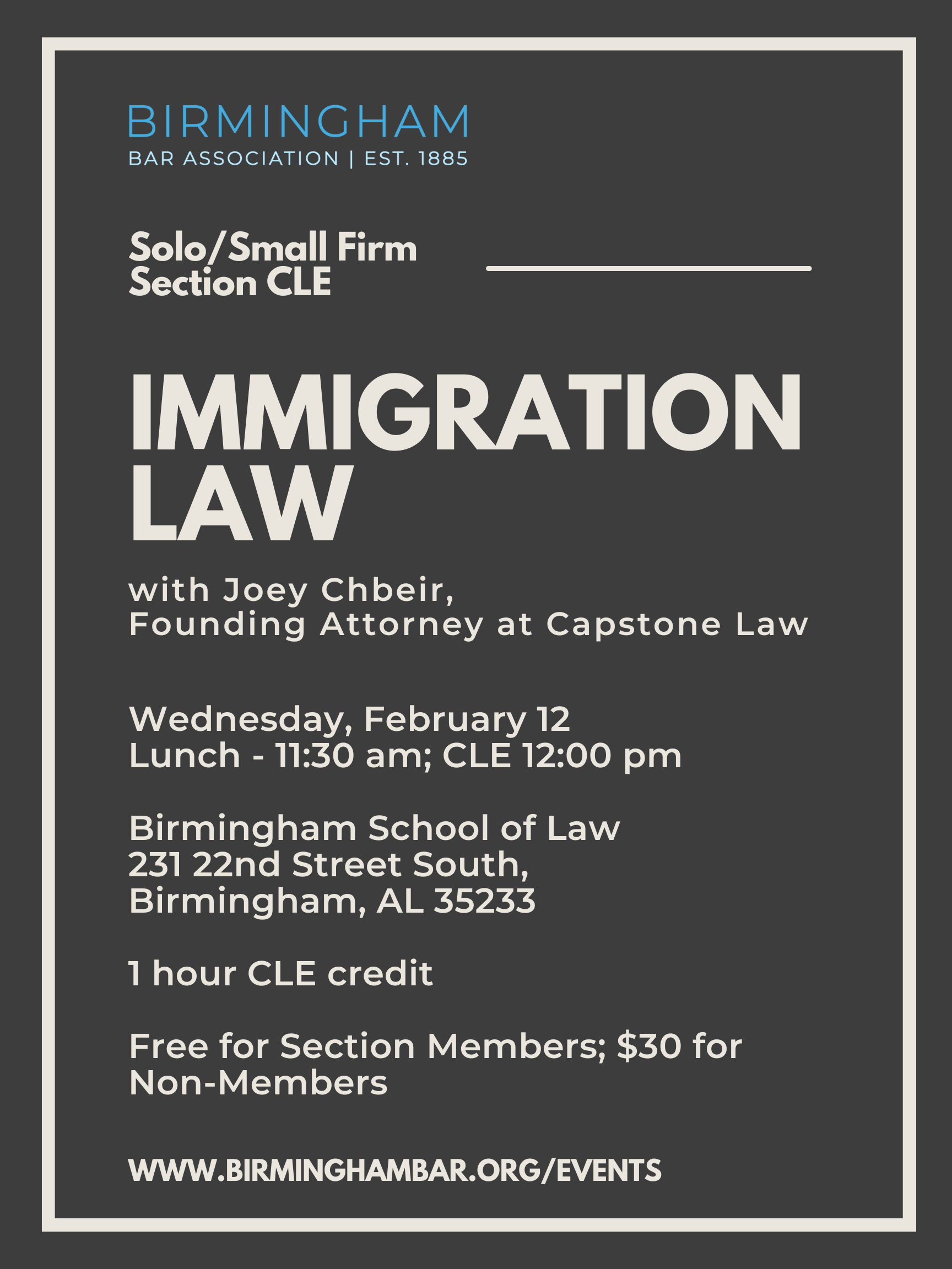 Join the Solo/Small Firm section for a CLE on Immigration Law, presented by Joey Chbeir, founding attorney at Capstone Law, LLC. A seasoned immigration lawyer, Joey has a significant amount of experience assisting multinational corporations in all aspects of the immigration process, including immigration related discrimination practices and the challenges surrounding foreign workers when negotiating mergers and acquisitions, and other corporate restructurings. He works with businesses, large and small, from a vast range of industry sectors to develop streamlined preparation of visa petitions and permanent residency applications, as well as to implement efficient and thorough employment verification compliance programs. Joey helps employers acquire employment-based visas for key employees to work in the United States. His experience includes obtaining temporary, nonimmigrant work visas in the E-1, E-2, E-3, H-1B, L-1, TN, J-1, Q-1, O-1, and Blanket L categories, and permanent immigrant visas (commonly referred to as “green cards”) based on the multinational executive and manager, investment, PERM labor certification, national interest waiver, extraordinary person, professional employee, and professor/researcher strategies. 1 hour CLE credit Lunch generously provided by Capstone Law, LLC Free for section members; $30 for non-members