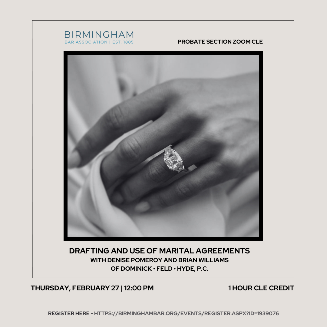 Join the Probate Section for a Zoom CLE: Drafting and Use of Marital Agreements Speakers: Denise Pomeroy and Brian Williams 1 hour CLE credit Free for section members; $30 for non-members
