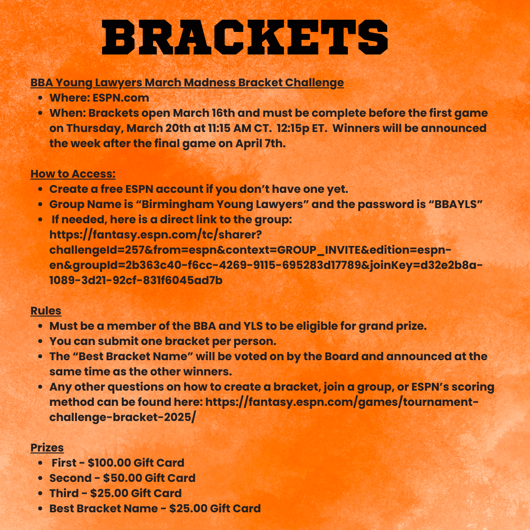 Don't miss this interactive CLE seminar on premises liability, hosted by the Young Lawyers Section! Justin Grammer, P.E., of Rimkus Consulting Group, will lead an insightful presentation followed by a valuable networking opportunity during the meet & greet. This seminar qualifies for 1 hour of CLE credit. Register quickly (here) – spots are filling fast! And be sure to participate in our March Madness Bracket Challenge, opening March 16th, for a shot at winning a door prize. Sign up -- here! Schedule 3:00 pm – 3:30 pm: Registration 3:30 pm – 4:30 pm: Premises Liability: Expert Insight Presented by Justin Grammer, P.E., of Rimkus Consulting Group 4:00 pm – 5:00 pm: Meet and Greet with Sponsors 5:00 pm – 8:00 pm: Game Time (refreshments and appetizers will be provided) Thank you to Rimkus, Veritext, Pangeatwo, Arriva, and Meaden & Moore for sponsoring!