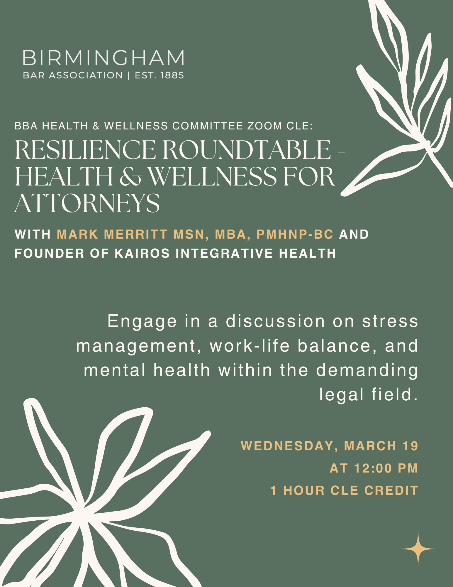 Join the BBA and the Health and Wellness Committee in welcoming Mark Merritt MSN, MBA, PMHNP-BC and founder of Kairos Integrative Health as he discusses how to manage stress, maintain a work-life balance, and prioritize mental health in the high pressure world of law.