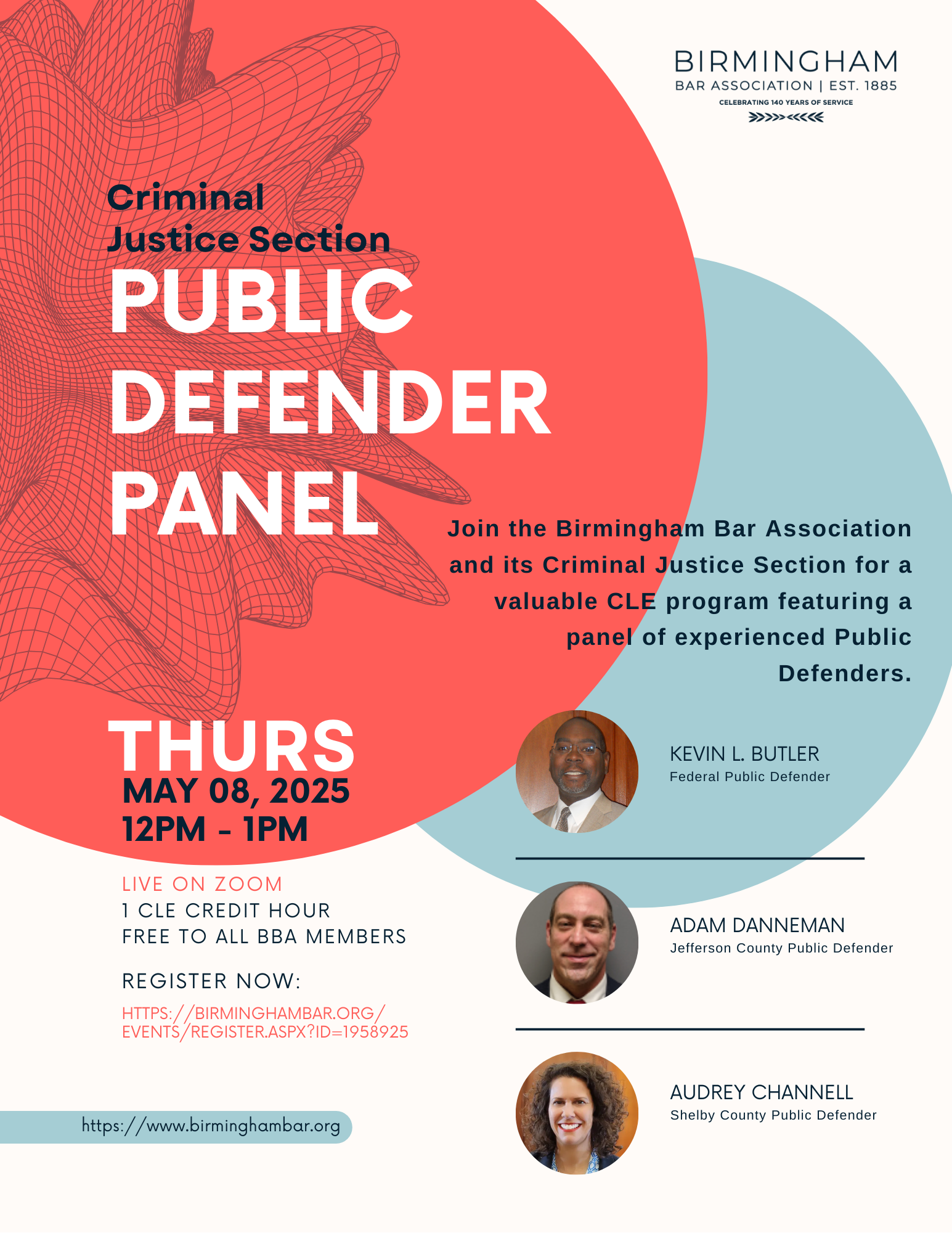 Join the BBA and the Criminal Justice Section in a Zoom CLE: Public Defender Panel Speakers: Kevin L. Butler, Federal Public Defender Audrey Channell, Shelby County Public Defender Adam Danneman, Jefferson County Public Defender 1 CLE credit hour Free to all BBA members Register here: https://birminghambar.org/events/register.aspx?id=1958925