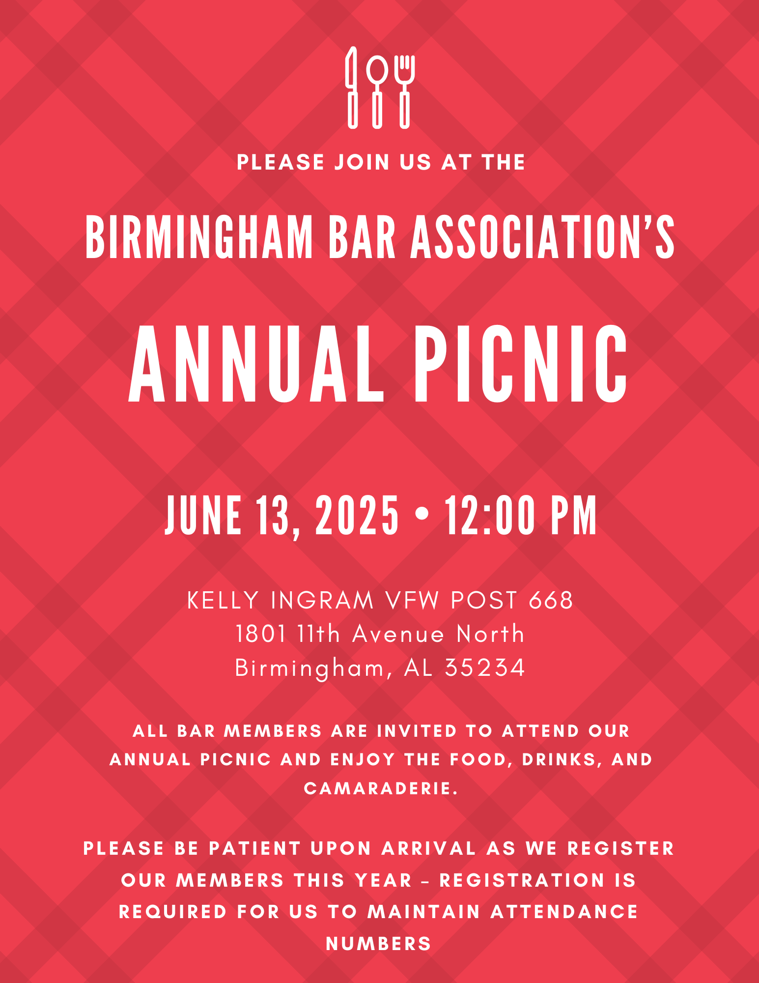 Please click here to view parking map Get ready for a fantastic Friday! It's time to celebrate at our Annual Picnic! After a morning dedicated to friendly competition, we invite you to unwind and connect with your fellow Bar Members at this beloved annual event. Join us for an afternoon filled with delicious food, refreshing drinks, and the best kind of company. It's the perfect opportunity to network, relax, and enjoy the camaraderie of our Bar community. We warmly invite all Bar Members to attend. Please be patient upon arrival as we register our members this year - registration is required for us to maintain attendance numbers. We can't wait to see you there!