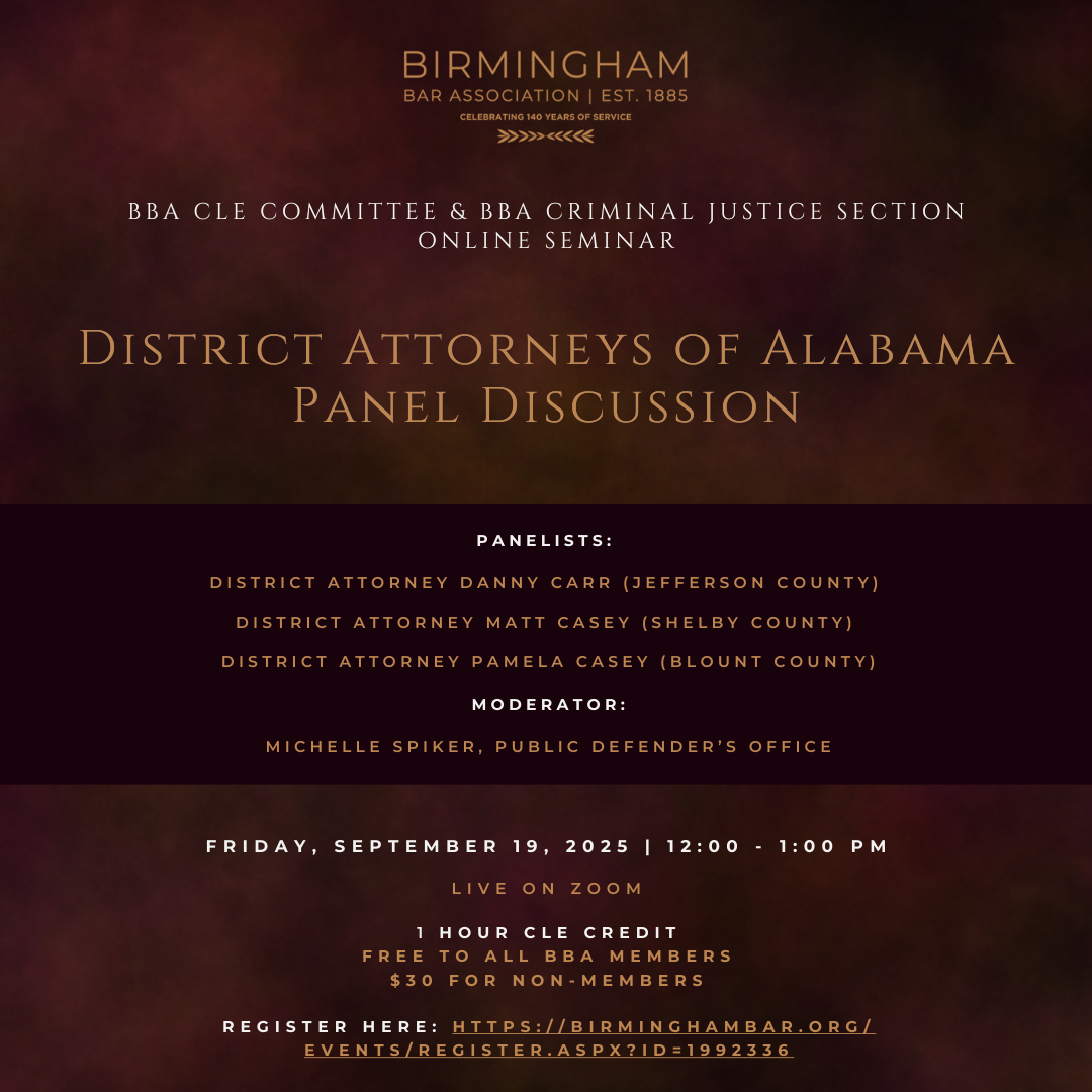 Join the BBA CLE Committee and the Criminal Justice Section for a Zoom CLE: District Attorney Panel featuring District Attorney Danny Carr (Jefferson County), District Attorney Matt Casey Casey (Shelby County), and District Attorney Pamela Casey (Blount County) Moderator Michelle Spiker 1 hour CLE credit Free for all BBA members; $30 for non-members